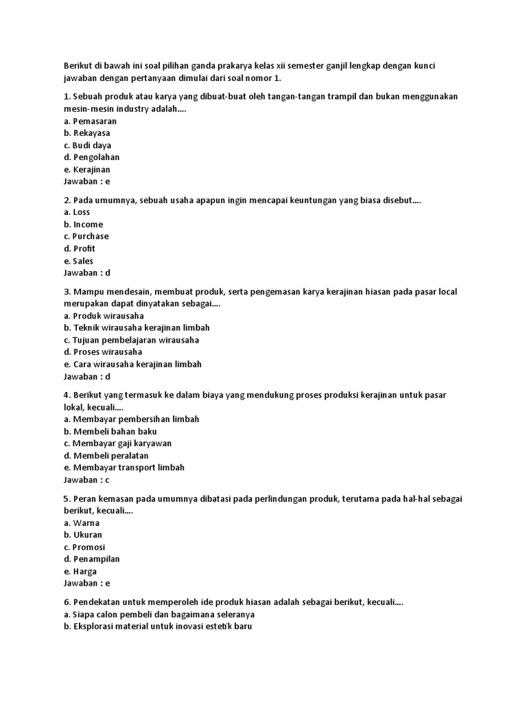 Berikut adalah kumpulan soal dan jawaban latihan TKA Prakarya yang bisa menjadi referensi belajar: