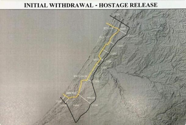 Dokumen militer AS yang bocor menunjukkan rencana jangka panjang untuk membagi wilayah Gaza menjadi dua zona, yaitu "zona hijau" di bawah kendali Israel dan militer internasional, serta "zona merah" yang dibiarkan begitu saja. Rencana ini mencakup pengerahan pasukan asing bersama tentara Israel di sebelah timur Gaza, dengan garis kuning sebagai batas antara kedua zona tersebut.