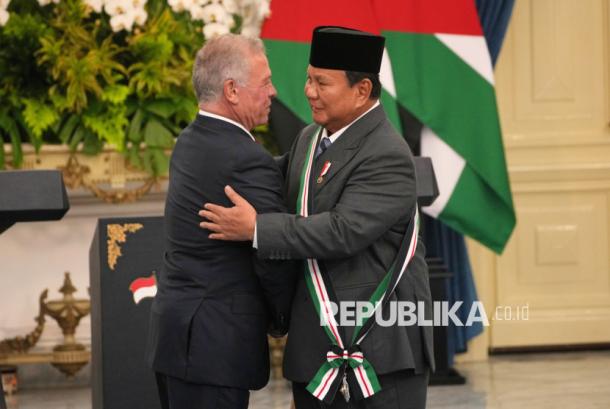 Presiden Prabowo Subianto (kanan) berpelukan dengan Raja Kerajaan Yordania Hasyimiah Abdullah II Ibnu Al Hussein seusai menerima gelar kehormatan di Istana Merdeka, Jakarta, Jumat (14/11/2025). - (AP Photo)