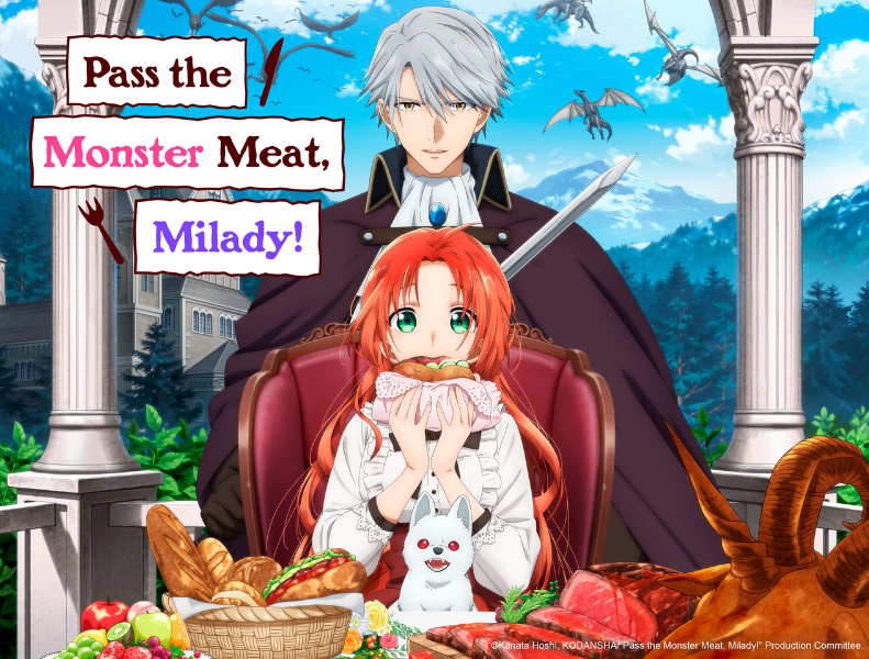 Bersama perkembangan romansa keduanya, penonton akan disuguhi petualangan kuliner memakan monster yang dianggap tak lumrah. Konsepnya hampir mirip dengan anime Delicious in Dungeon yang menganggap rasa monster menjijikkan dan bisa menyebabkan keracunan. Meski keduanya sama-sama mengandalkan percobaan untuk mengolah monster, Pass the Monster Meat, Milady! punya tahapan unik berupa pengolahan energi magis sebelum monster bisa dijadikan bahan makanan yang layak.