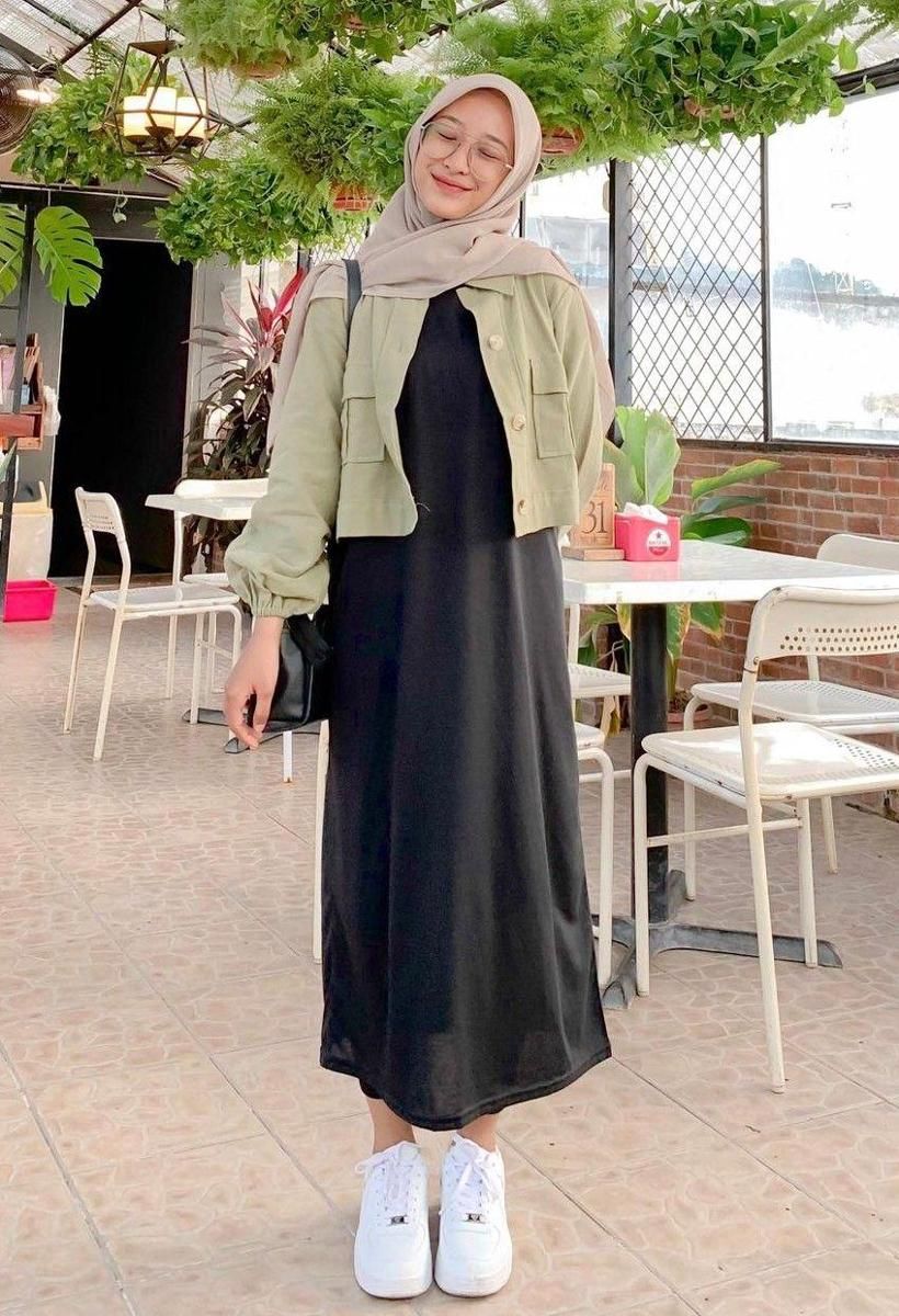 Kalau ingin membuat kesan yang lebih muda dan fresh dengan inner dress hitam, kamu bisa memadukannya dengan cropped kemeja warna sage green. Warna ini memiliki kesan yang fresh dan ceria, apalagi dilengkapi dengan hijab warna senada.