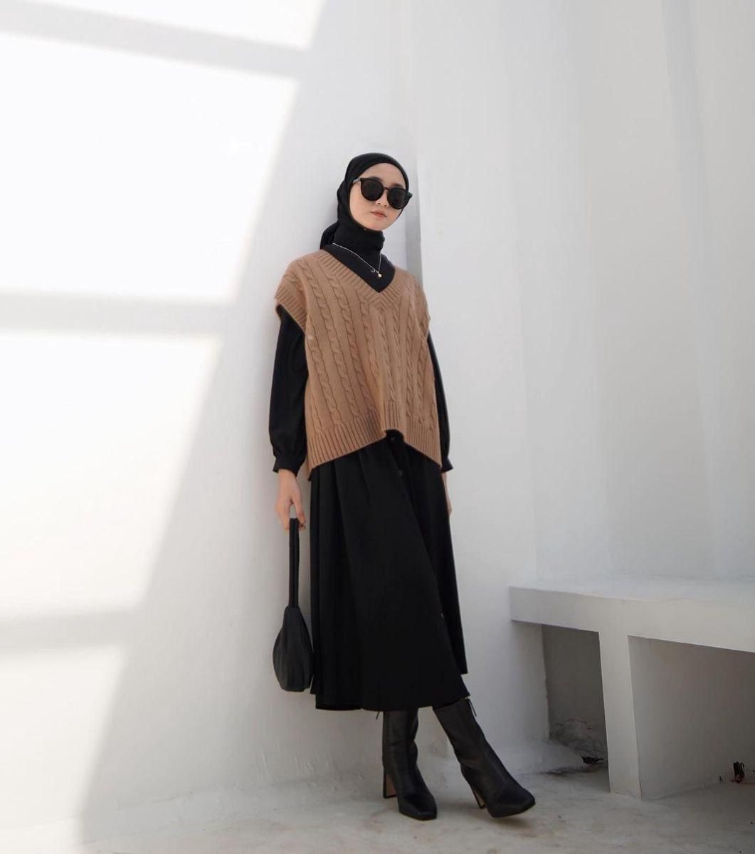 Kemudian, kenakan pula hijab, sepatu boots, dan sling bag warna hitam pula supaya semakin keren. Nah, outfit ini akan cocok bagi kamu yang ingin tampil edgy untuk berbagai situasi.