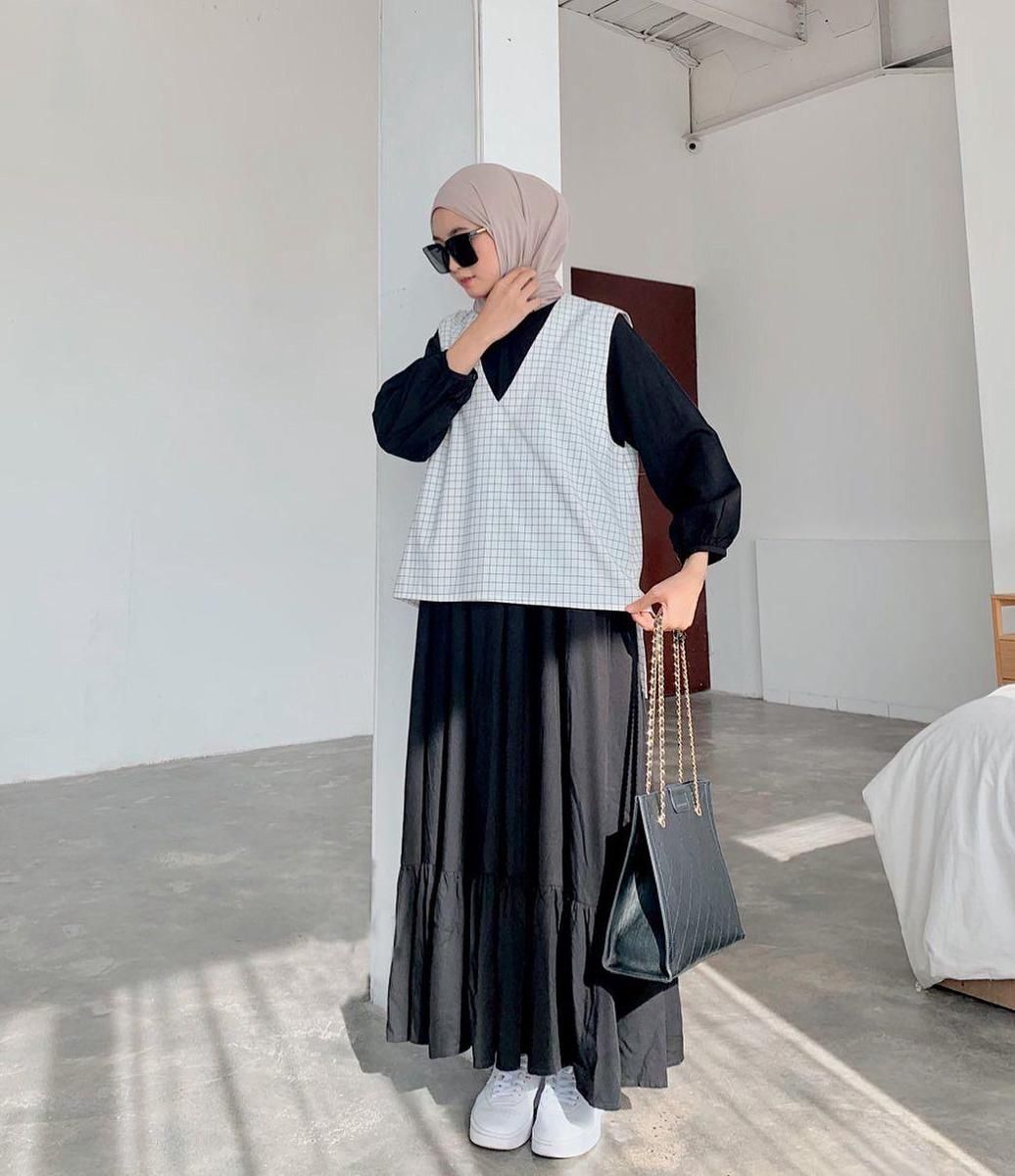 Vest tersebut berwarna putih dengan motif kotak-kotak, sehingga tampak kontras saat dikenakan. Sebagai aksesorinya, pilihlah sneakers putih, hijab, dan sling bag warna hitam yang senada.