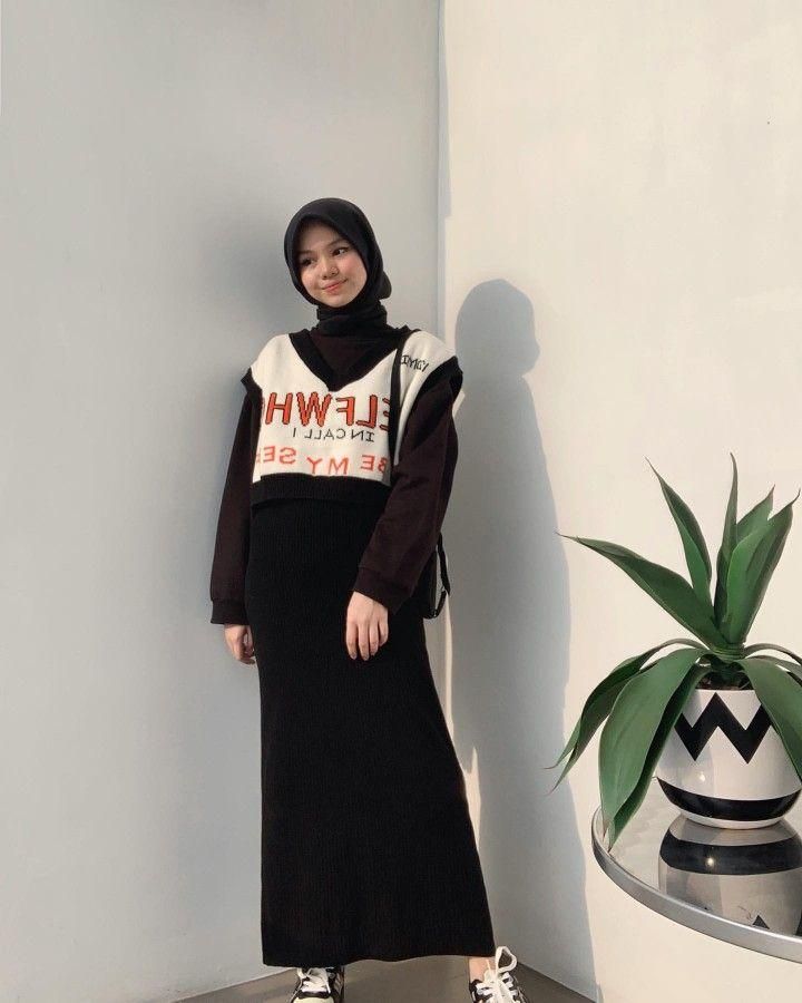 OOTD inner dress hitam akan semakin keren jika dipadukan dengan outfit serba hitam lainnya. Seperti di atas, inner dress ini dikenakan dengan dilengkapi quilted vest yang hangat.